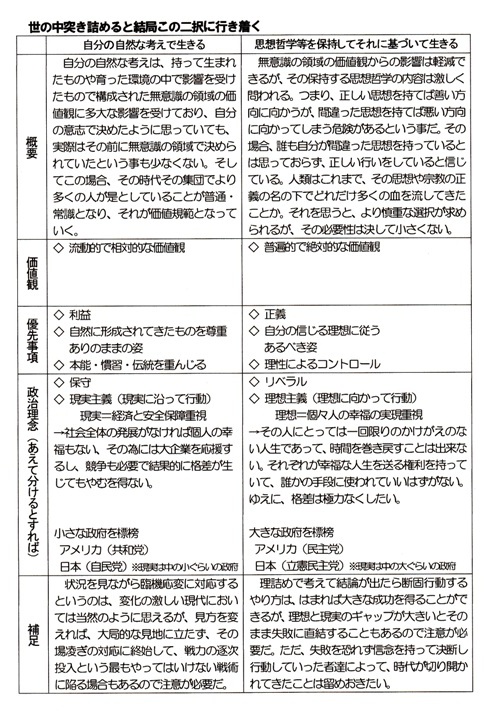 人が持っている価値観には、「無意識の領域」と「意識の領域」があって、無意識の領域には、「持ってうまれたもの」と「育った環境の中で影響を受けたもの」があり、意識の領域には、「自分の自然な考え」と「自分の意志で選択した人生哲学」があります。そして、人の生き方を突き詰めると、この自分の自然な考えで生きるか、それとも自分の意志で選択した人生哲学を保持してそれに基づいて生きるかの2択になります。そこに自分が所属する社会の主義が影響を及ぼしてくることになります。