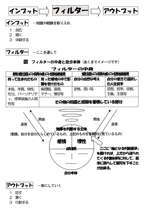 様々な情報や知識をインプットして、自分というフィルターを通して、そこに付加価値を加味してアウトプットする。そのアウトプットの内容によっては、人類の幸福に大きく貢献することもできます。そうなると、そのフィルターの如何によってアウトプットされる内容が左右されるので、いかに自分の持っているフィルターをより良いものにして、高付加価値のものを加味していけるかがポイントになるし、どのようなフィルターを持っているかが問われることになります。